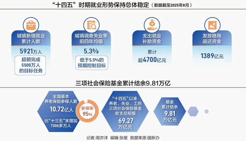 “十四五”以来,三项社会保险基金收支总规模69.27万亿元,基金累计结余9.81万亿元。